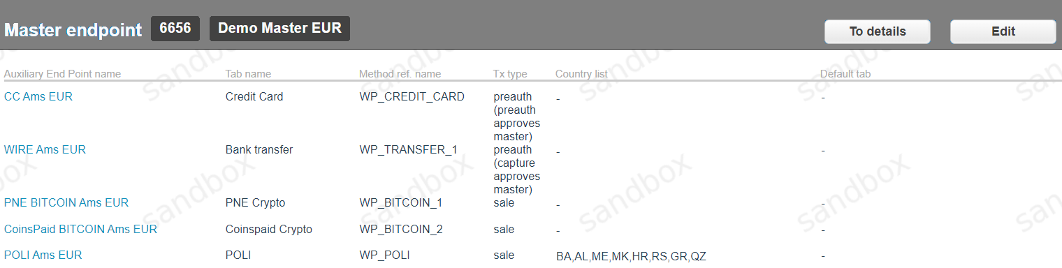Below is an example of configured Master Endpoint with multiple available payment methods represented by Auxiliary Endpoints connected to it: