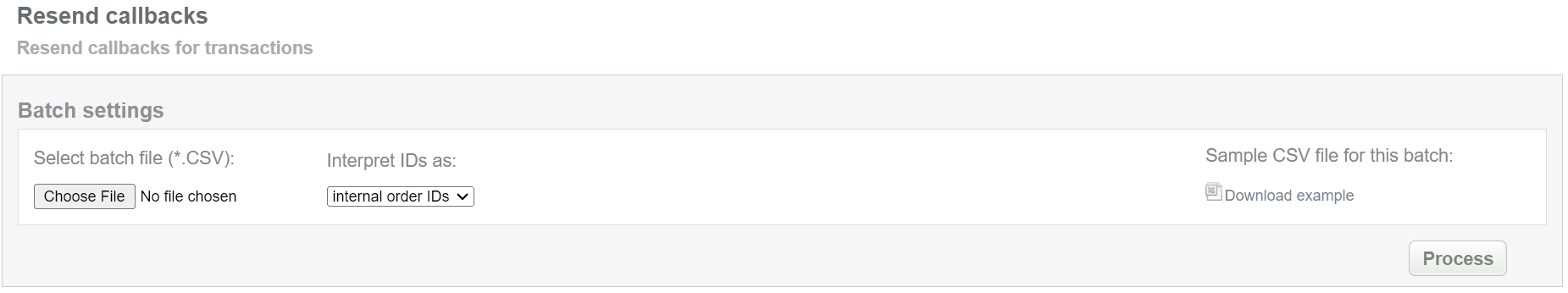 This batch operation can be useful if information on the final status of transactions is available in Sepagon system and for some reason is not available in the Connecting Party system. Collect the order IDs, assigned by Sepagon system to the CSV file and upload it to send new callback notifications. An example of CSV file for upload is available on the same screen.