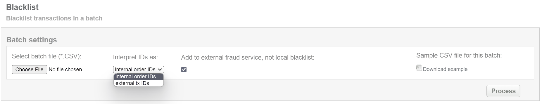 This batch operation, in according to specified input, puts cards in blacklist or external fraud system if such is set up. Collect the order IDs, assigned by Sepagon system to the CSV file and upload it to blacklist card of selected transactions. An example of CSV file for upload is available on the same screen.