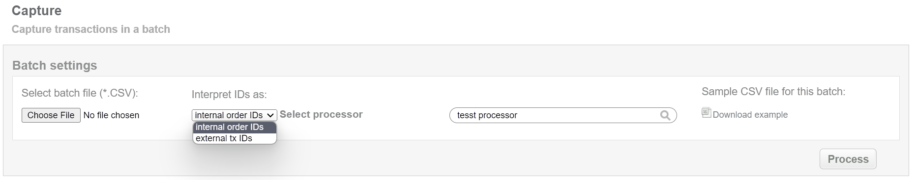 This batch operation can be useful for deducting the locked amount from preauth transactions (preauth should be in approved final status) in according to specified input. Collect the order IDs, assigned by Sepagon system to the CSV file and upload it to make capture of selected transactions. An example of CSV file for upload is available on the same screen.