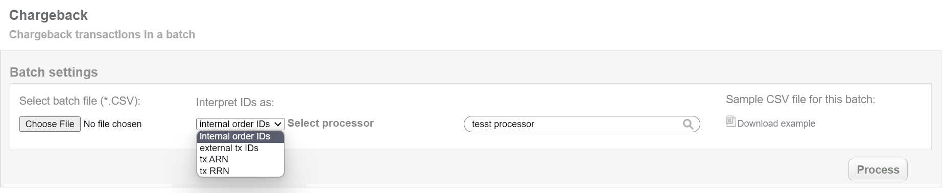 This batch operation can be useful if for some reason reversal was not made to prevent a chargeback and creating chargeback transaction according to specified input is needed. Collect the order IDs, assigned by Sepagon system to the CSV file and upload it to make chargebacks for selected transactions. An example of CSV file for upload is available on the same screen.