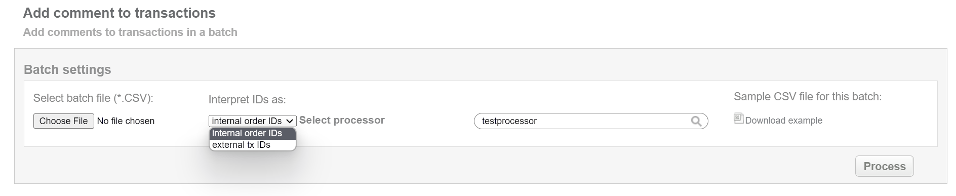 This batch operation can be useful for adding a or an additional comment to transactions in according to specified input. Collect the order IDs, assigned by Sepagon system to the CSV file and upload it to add comment for the selected transactions. An example of CSV file for upload is available on the same screen.