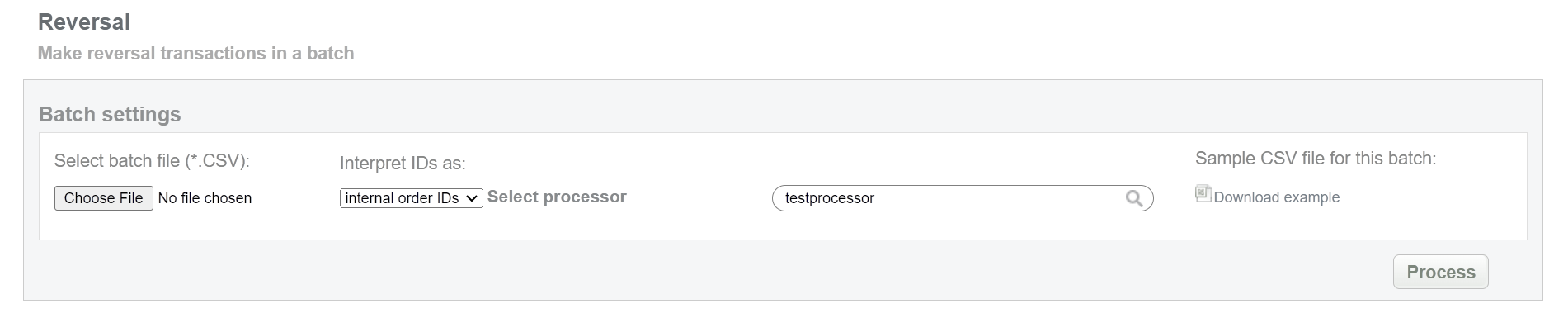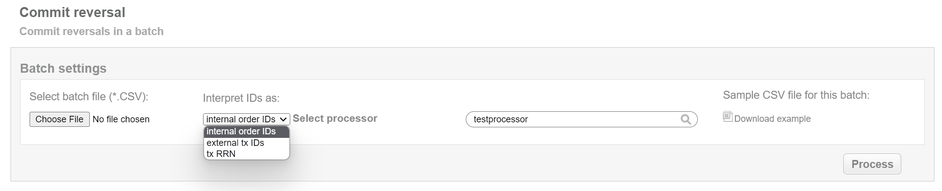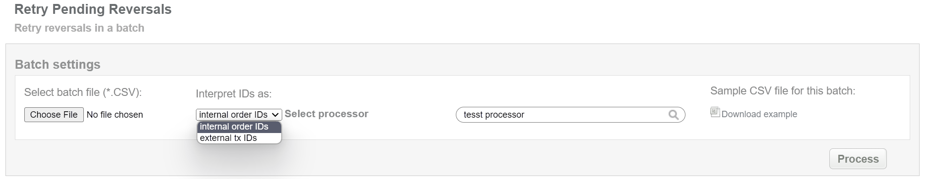 This batch operation re-sends reversal request for pending reversals in according to specified input. Collect the order IDs, assigned by Sepagon system to the CSV file and upload it to make reversal of selected transactions. An example of CSV file for upload is available on the same screen.