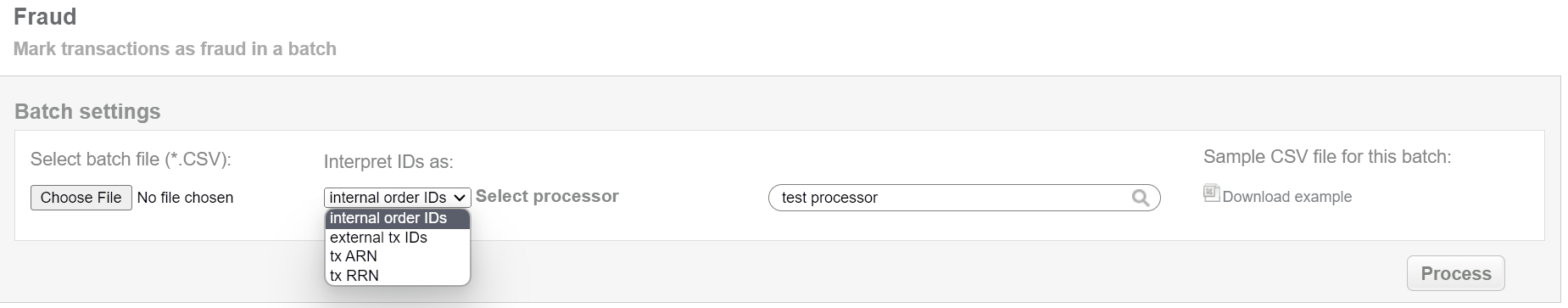 If Connecting Party suspects transaction to be fraudulent, then this batch operation can be useful for marking transactions as fraud in according to specified input. Collect the order IDs, assigned by Sepagon system to the CSV file and upload it to mark selected transactions as fraud. An example of CSV file for upload is available on the same screen.