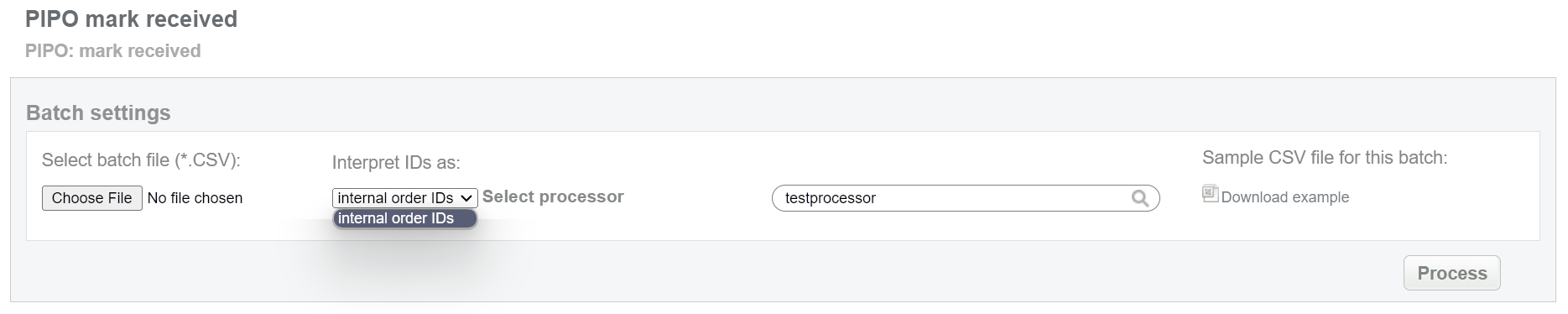 This batch allows to mark pending bank transfer as received. This status equals to “approved” for preauth transaction. Collect order IDs, assigned by Sepagon system and enter all information to the CSV file and upload it to mark PIPO payments as received. An example of CSV file for upload is available on the same screen.