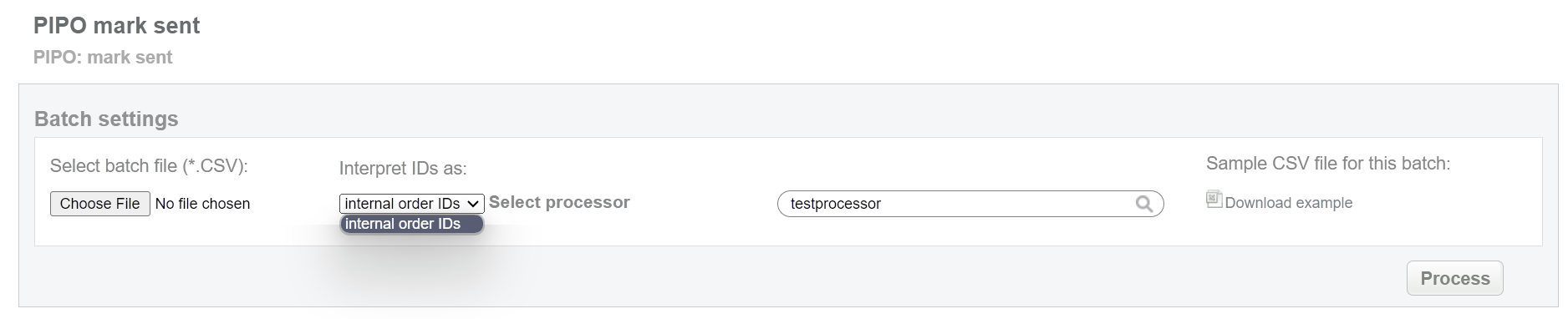 This batch operation allows to mark pending bank transfer as sent (but not received yet). This status equals to “processing” for preauth transaction. Collect order IDs, assigned by Sepagon system and enter all information to the CSV file and upload it to mark PIPO payments as sent. An example of CSV file for upload is available on the same screen.