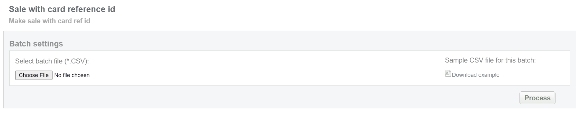 This batch operation can be useful for initiating sale without any card information using only card reference ID. Collect the Endpoint and Card reference IDs, assigned by Sepagon system and enter all information to the CSV file and upload it to initiate sale transactions with card reference ID. An example of CSV file for upload is available on the same screen.