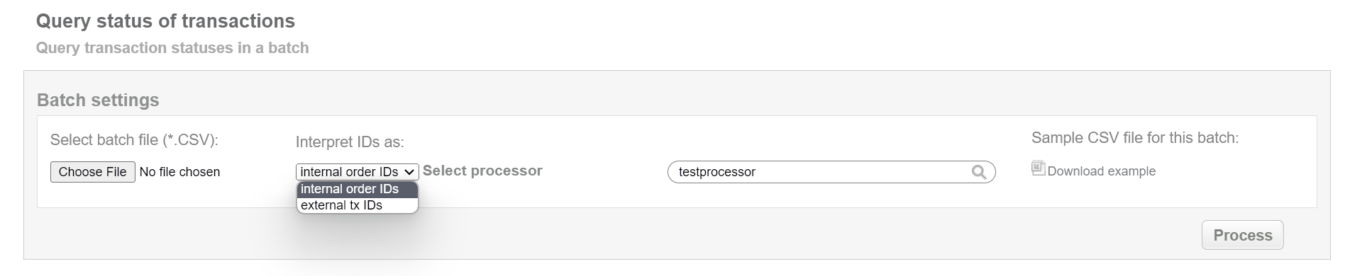 This batch operation can be useful for requesting status of transactions (doesn’t matter in what status) in according to specified input. Collect the order IDs, assigned by Sepagon system to the CSV file and upload it to request status of the selected transactions. An example of CSV file for upload is available on the same screen.