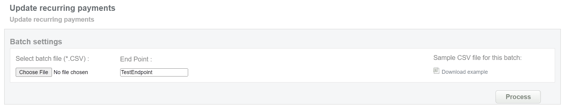 This batch operation can be useful for updating recurring payments (new customer data and etc.) for transactions that require regular debits with the same data. Collect the recurring order IDs, assigned by Sepagon system and enter all information to the CSV file and upload it to update recurring payments information. An example of CSV file for upload is available on the same screen.