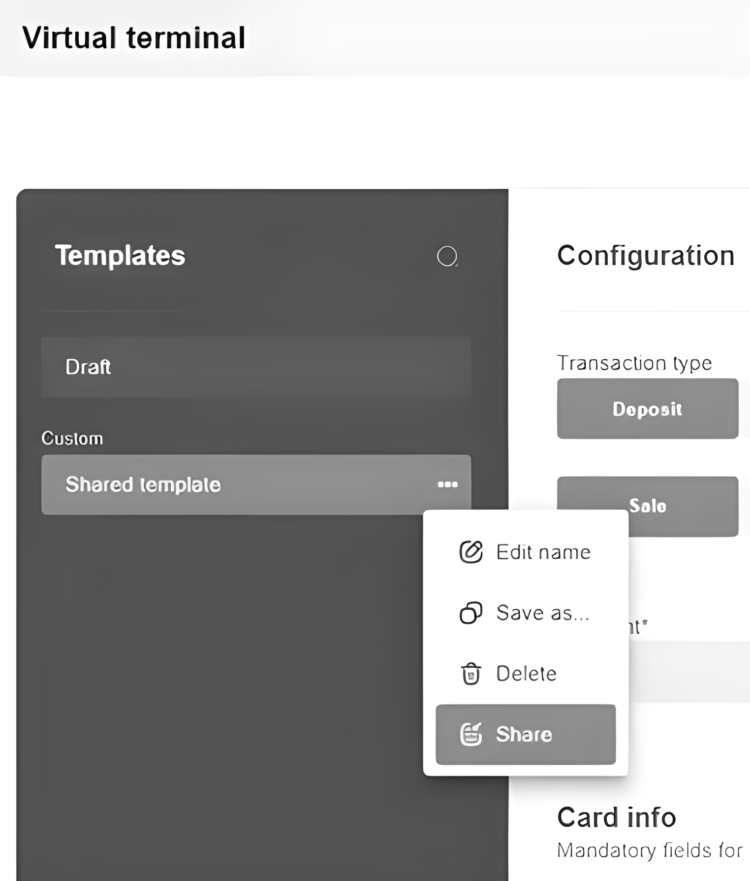 3) To edit, clone, delete or share, click three dots near the template name and select the desired parameter. The template can be shared with users at lower levels. This way, a merchant can share the template with their employees.