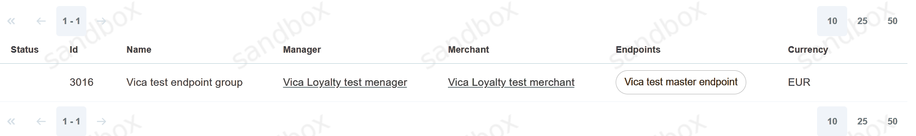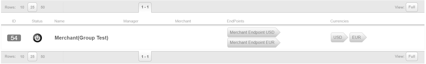 Endpoint group is an entity that combines several Endpoints or Master Endpoints with different currencies. The Endpoint Group simplifies the integration of a Merchant business to Sepagon Payment Gateway when working with multiple currencies. This screen allows to view configured Endpoint Groups and their IDs.