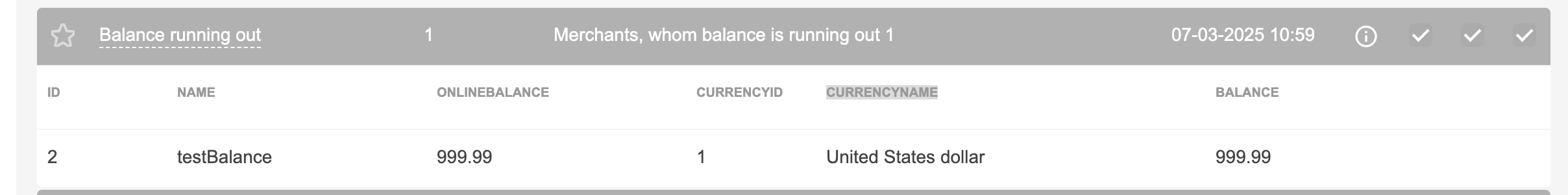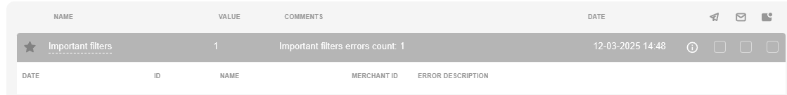 The screen is located in “Tools” – “Monitoring” section. This screen displays information about various errors that usually require quick response, as well as the options to subscribe for notifications about any errors via Telegram, Email or Push notification. Phone number and e-mail address are taken from the personal account (Merchant or its employee account).